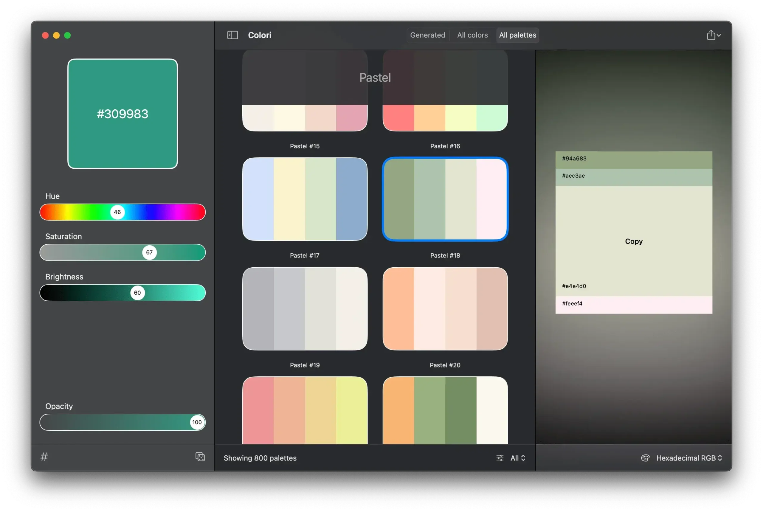 输入任何原始颜色后,您将能够立即看到生成的所有颜色和谐,或浏览 Colori 附带的大量调色板!