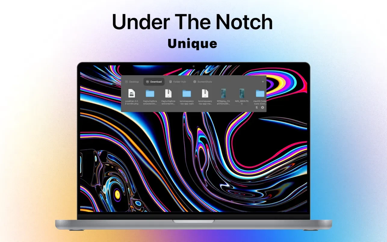 默认情况下,文件夹集线器窗口隐藏在 MacBook 剪切口下。当鼠标移动到剪切区域时,文件夹中心窗口将变为可见,当您将鼠标移动到文件夹中心窗口之外时,它会再次隐藏。